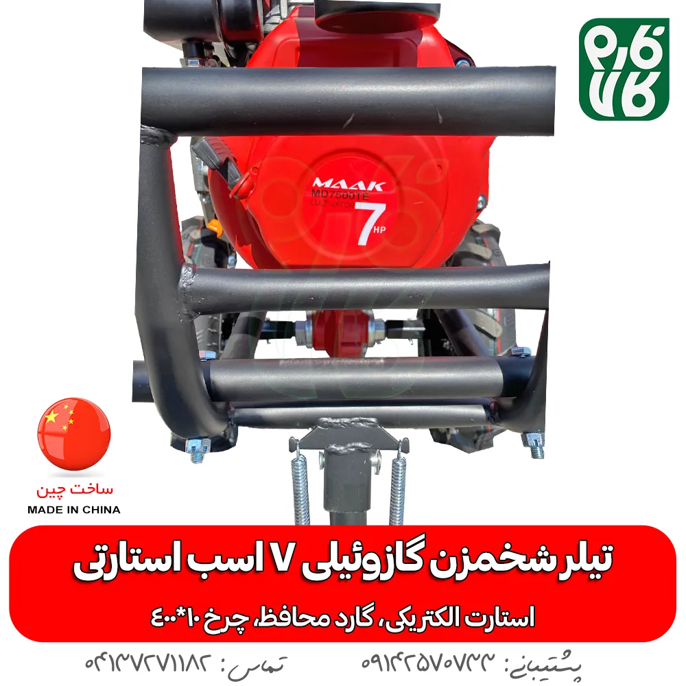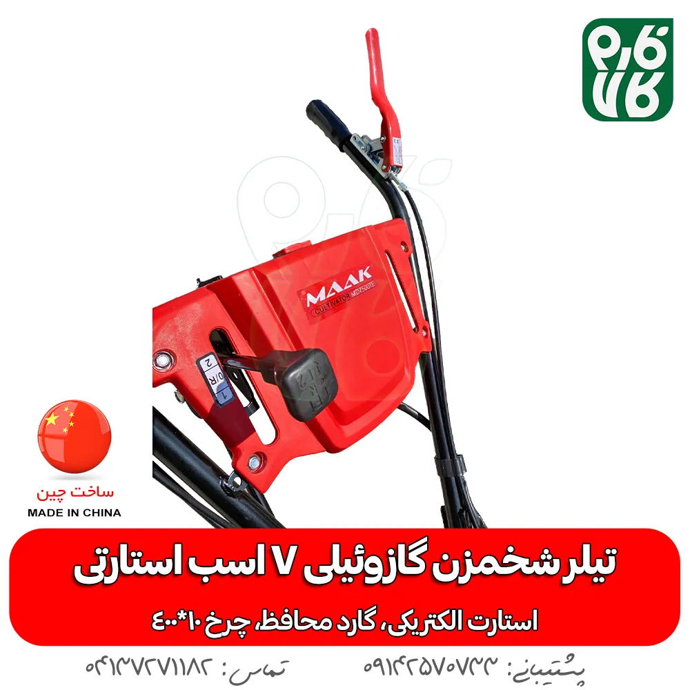 تیلر باغی گازوئیلی ماک، یکی از تیلرهای با کیفیت بازار هست و برای شخمزنی در بیشتر شرایط خاکی مناسب هست. شخمزن درجه یک ماک مدل MD7500TE بصورت استارتی عرضه میشود ولی برای جلوگیری از خراب شدن باتری طی مدت انبار داری، دستگاه بدون باتری عرضه میشود تا در صورت نیاز، خود کاربر باتری با تاریخ جدید تهیه نماید. کیفیت این محصول از طرف فارم کالا تایید شدهاست.